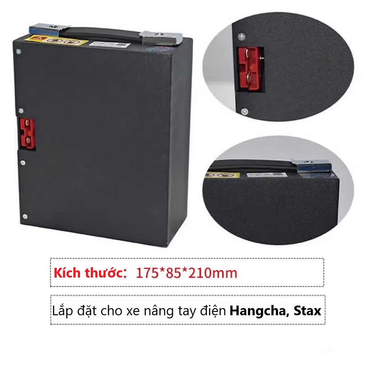 Với điện áp 48V và dung lượng 15Ah, phụ tùng xe nâng này cung cấp nguồn điện mạnh mẽ, ổn định. Điện áp sạc tiêu chuẩn 54,6V kết hợp với giắc cắm theo tiêu chuẩn Hangcha và Stax, bảo đảm khả năng tương thích cao và tiện lợi khi sử dụng.